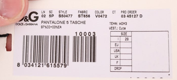 Step into comfort and luxury with the Dolce & Gabbana Elegant Green Cotton Blend Trousers. These stunning trousers are meticulously crafted to elevate your everyday style while adding an exquisite touch of sophistication to your evening ensemble. The blend of 97% cotton and 3% elastane provides durability along with a hint of stretch, ensuring a perfect and flattering fit for every occasion. The zipper and button closure enhances ease, while the two front and two back pockets provide practicality without compromising style. Adorned with subtle logo embellishments, these trousers embody the essence of Italian craftsmanship, marrying luxurious material with modern design.
